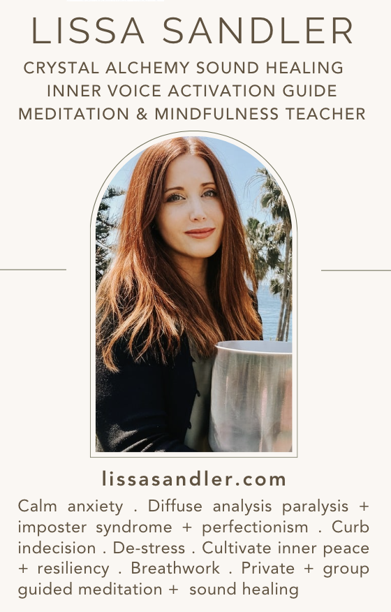 Lissa, Crystal Alchemy Sound Healer, Meditation Teacher, Inner Voice Guide and Wellness Brand Mentor, offers Crystal Alchemy Sound Healing Journeys with guided meditation to help calm your nervous system, get out of fight, flight, and freeze states, and create a balanced inner environment that promotes healing.